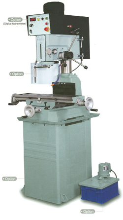 OPTIONAL ACCESSORIES: 1/2" drill chuck 3" face mill chuck 3" U type vise 5 in 1 or 3 in 1 valued package (see photos) 52 pcs clamping kits Coolant system with color box (0.98 cuft) Digital readout Deluxe stand Face milling cutter Halogen light NT#30 spindle taper Power table feed Tapping switch for 3ph motor Work lamp