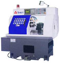 FANUC or Mitsubishi control system MPG manual position unit X and Z axis are assembled with precision linear guides for fast rapid traverse Two spindles bar capacity to choose from: 32mm and 42mm. Gang tooling or 8 position disc turret Hydraulic chuck and cylinder Cartridge spindle with heat dissipation fins on headstock for to minimize thermal expansion Integrated full splash guard housing to ensure operator safety and clean environment Solid one piece bed for maximum rigidity Rear parts catcher (opt.) Tailstock and programmable quill Hydraulic unit High pressure co