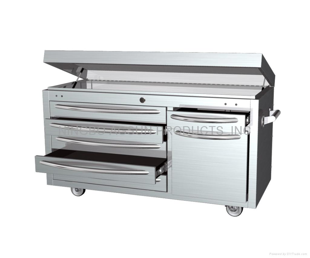 Model NO.:G607A Description:Brushed 430 stainless steel material; 2 pneumatic lifts for top lid; 4 nylon bumpers for top lid; anti-slide mat for each drawer;2 handles for easy moving; 1 locking system for all drawers; 4 wheels for selection, two with casters; Reinforced contruction for the double wall side panels and top deck; Heavy duty full extension drawer slides; Bumpers for each drawer; Constructed using precision laser cutting and seamless welding.