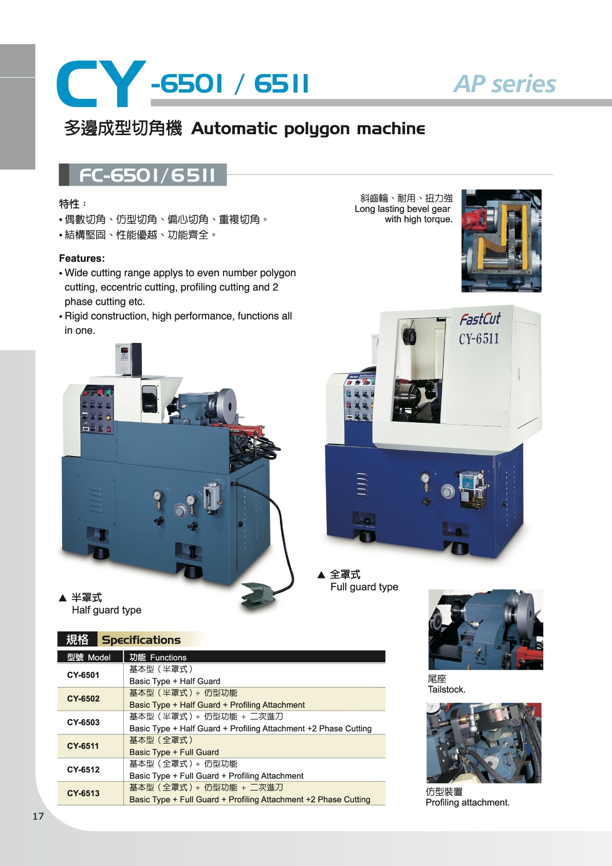 Wide cutting range applys to even unmber polygon cutting, eccentric cutting, profiling cutting and 2 phase cutting etc. Rigid construction, high performance, functions all in 1.