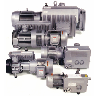 Principle of operation: These vacuum pumps work according to the rotary vane principle. An eccentrically installed rotor rotates in the cylinder. The centrifugal forceof the rotation pushes the vanes, which glide in slots in the rotor, towards the cylinder wall. The vanes separate the sickle-shaped space between rotor and cylinder into chambers. When the chambers are connected with the inlet channel, gas is sucked in, compressed by the next rotation and pushed into the oil separator. Differential pressure constantly causes oil to be passed into the co
