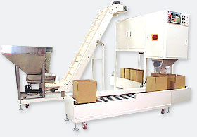 The kind packing machine has exclusive design for screw of auto-weight packing and packing materail can use carton with gunny-bag.