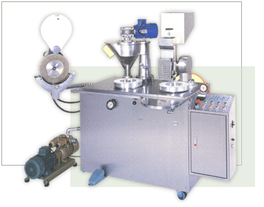 All stainless shells, hoppers and surface plates meet G.M.P. requirement. Infinitely variable fill table speed with independent power for fix point filling. Results in precise weight within 3% deviation. A Hydraulic power joint system increases joint efficiency, without any damage to capsules. A special design allows for changing molds for different size capsules within 15 minutes--easily, simply, p recisely. Simple structure, easy to maintain and clean. So simple to operate one can learn in 10 minutes; only one operator required. No noise, no public hazard. All new semi-automat