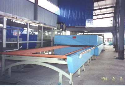 Outer dimension: 5930 mm (L) X 2000 mm (W) X 2500 mm (H) Overall dimension: 9000 mm (L) X 4000 mm (W) Max. Size of glass: 600 mm X 1000 mm Min. Size of glass: 50 mm X 50 mm or 65 mm Glass thickness: 2.8 mm ~ 19 mm Heating power: 58 KW Blower: 112.5 KW Air compressor: 7.5 KW Total power: 180 KW