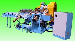 S-B25S Automatic Can Body Separator horizontal design. Scored can cylinder is carried by a timing screw and a turret. Inner cutter shaft enter can inside and carry cans forward to meet an arc outer rail blade. Cutter edge squeeze the scoring line to separate the can cylinder. Separated can cylinders exit by two individual outlet chutes. With centralized greasing system and multiple safety devices, easy for maintenance and can size changeover.