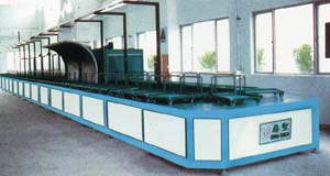 Feature: It is a space-saving one-line conveyor. The plates of shoes (for placing shoes) can be designed in accordance with customer's demand.2 layers(715m/m),3 layers(845m/m) and 4 layers(1062m/m) are available and there are movable ovens whose distance can be adjusted according to the output and the shoes. The length can be designed to comply with working circumstances¡C