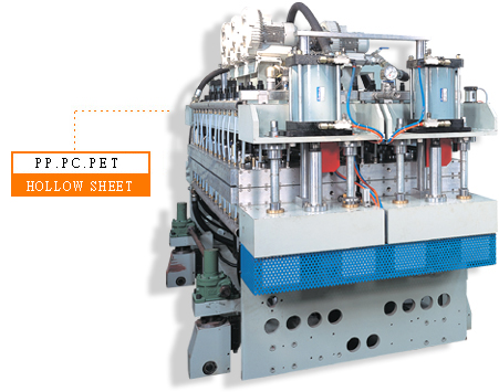 FEATURES : The equipment can be mountd on a used hollow sheet extruding machine from various countries, such as, Germany, Japan, Italy, etc. GMA has extensive experience in equipment installations. Thickness setting is conveniently controlled by computer without stopping the machine thereby reducing waste to minimum. When PP hollow sheet is produced through this power saving and space saving device, an extremely smooth sheet surface can be obtained without the need of drying oven treatment. The forming unit is manufactured from specially treated material assuring maximum wear resistanc