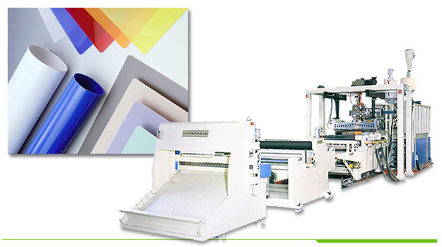 T-die Width 1300mm Product thickness 0.2-2mm Product width 1220mm Temperature controller 3 sets Taking roller 1 set Divide into parts unit 1 set Micro Computer cut unit 1 set Winder unit Optional Electric controller Adopt SSR and PLC system Total weight 20 tons Occupied ground area 13695mm x 3000mm x 3030mm (L x W x H)