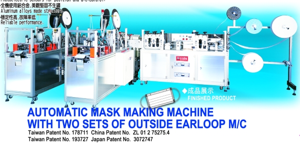MACHINE FEATURES: Fully automatic mechanism from mask blank and earloop welding Reliable performance Aluminum alloy made structure PLC control Photoelectric sensors for positioning control Printing device, optional accessories