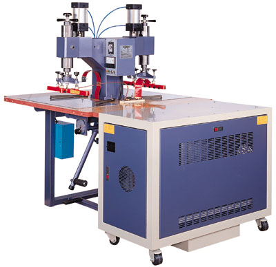 The high frequency plastic welding machine with high pressure installation for materials of thickness PVC, TPU, PU, leather's special process of brand, convex, concave surface. Application Trade mark labels, Footwear, Clothes, Belt, Camera Bag, Handbags...etc.