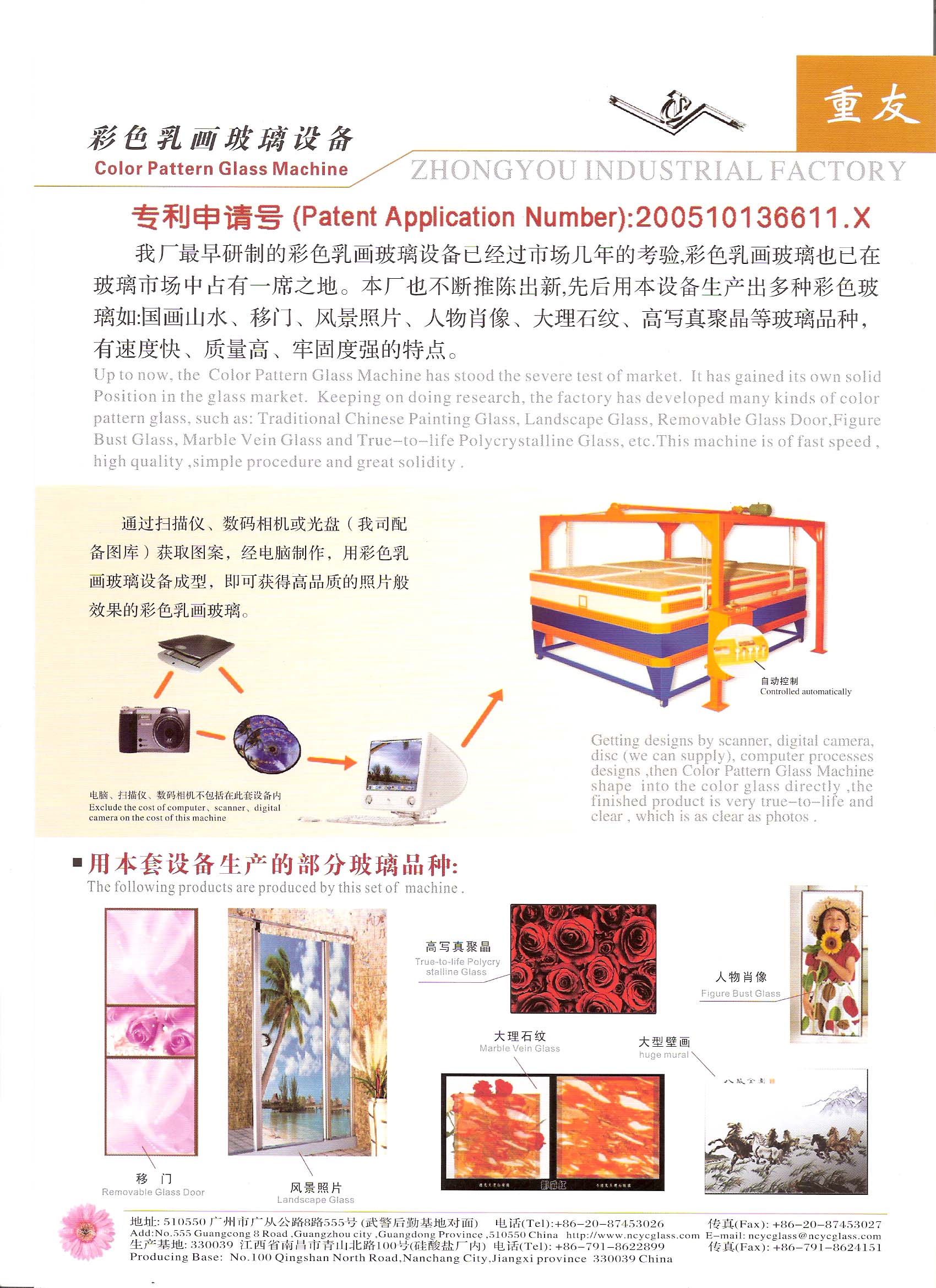 GuangZhou ZhongYou Glass Machinery Factory is an enterprise devoted to glass processing and decorative glass machinery manufacture. It is specialized in the research and development of new technology and new products. Market-oriented, it has established a whole set of relatively complete system, including marketing investigation, information analysis, feasibility proving, products testing, achievements spreading and after-sales service, etc. Since its establishment, this factory has developed many kinds of glass processing equipment such as Frosting Glass Machine Art Decorative Color Pattern Design Glass Machine, Screen printing decorative glass machine (acid deep-etched pattern glass machine ) . And with the help of these machines, this factory also develop various kinds of art glass, such as acid deep-etched pattern Glass, non-fingerprint Glass, Series of Hazy Glass, Frosting Glass and decorative color pattern Glass, laminated safety glass, non-reflection glass etc. All of these machines and products have been exported to India, Saudi Arabia, Russia and Japan and so on, and they all enjoy high popularity and favorable comments. |
