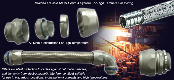 metal wire over braided flexible conduits, liquid-tight flexible conduits, flexible metallic conduits, connectors & fittings, flexible conduits assemblies, connector ferrule, conduit clips, lock nuts, flexible hose for other applications, oem products.