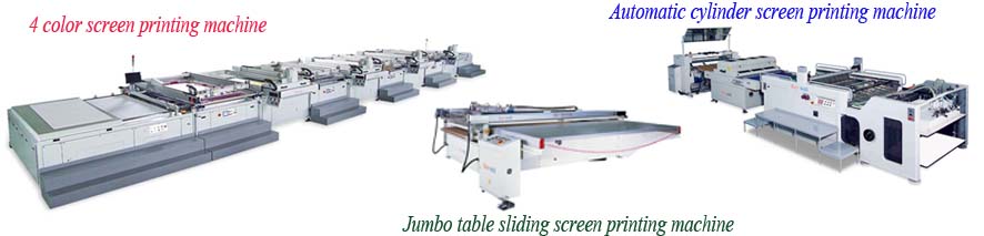 Pre-printing: Screen stretching machines, screen washing stand, exposure machines, squeegee grinding machines. Printing: Automatic cylinder screen printing machine, multicolor screen printing machine, glass screen printing machine. |