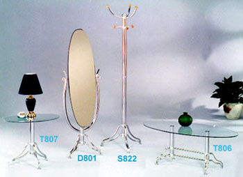 No. DESCRIPTION UNIT PRICE(F O B) MEASURMENT T807 End Table 63 x 45 x 53cm H. 8mm clear glass Chrome plated finished Aluminum color painfing finished Blockcolor paintingfinished US$ /PC. US$ /PC. US$ /PC. 1 pc./0.9 D801 Cheval-glass 53 x 45 x 152cm H. 3mm mirror Chrome plated finished Aluminum color painfing finished Blockcolor paintingfinished US$ /PC. US$ /PC. US$ /PC. 1 pc./1.5 S822 Hall Tree 180cm H. Chrome plated Aluminum color painfing finished Blockcolor paintingfinished US$ /PC. US$ /PC. US$ /PC. 1 pc./0.3 T806 Coffee Table 56 x 110 x 43cm H. 8mm clear glass Chrome plated finished Aluminum color painfing finished Blockcolor paintingfinished US$ /PC. US$ /PC. US$ /PC. 1 pc./1.75