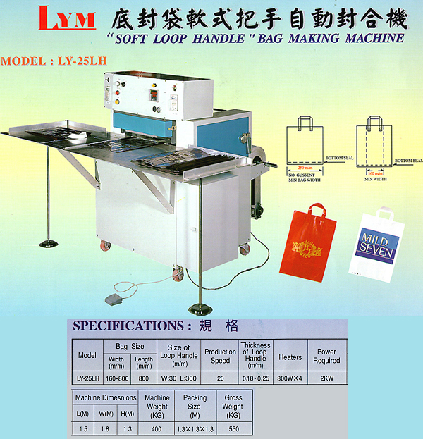 Size of Loop Handle: (W)30mm, (L)360mm Thickness: LDPE 0.18 - 0.25mm Packing Size: 1.3 x 1.3 x 1.3 (m) Machine Weight: 400Kgs Gross Weight: 550Kgs Electrical Consumption: 2Kw TAIWAN patent No.: 147812 CHINA patent No.: ZL 94246709.4