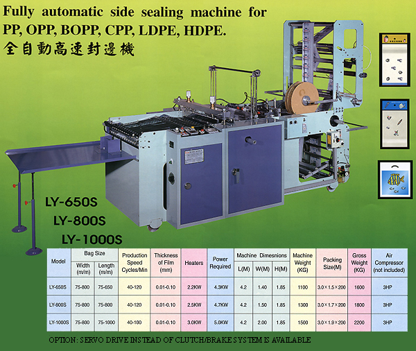 We use good parts with famous brand from U.S.A, GERMANY, FRANCE, ITALY, JAPAN etc. Machine frame is made of thick steel plate for stability at high speed operation. Easy to operate & maintain. Specially design for producing garment bag with self adhesive glue tape. OPTION: Hot roller sealing device for OPP stationery bag. Ultra-Sonic Sealing Device for OPP stationery bag. Hole punching device. (6mm, 8mm, 10mm, etc.) Handle Punching Device. (Kidney shape) Heavy duty unwind stand with E.P.C. & powder brake. Round bottom chicken bag making device. Inverted "T" shape hanger hole punching device. (Butterfly hole punching device) DHL bag making device. (Courier service bag) Flower-shape bag making device. (For packing Flower) Corner sealing device. (Slant sealing at bag's bottom for standing pouch) Triangle folding device (For folding single sheet PE film to run in-line with the machne) |