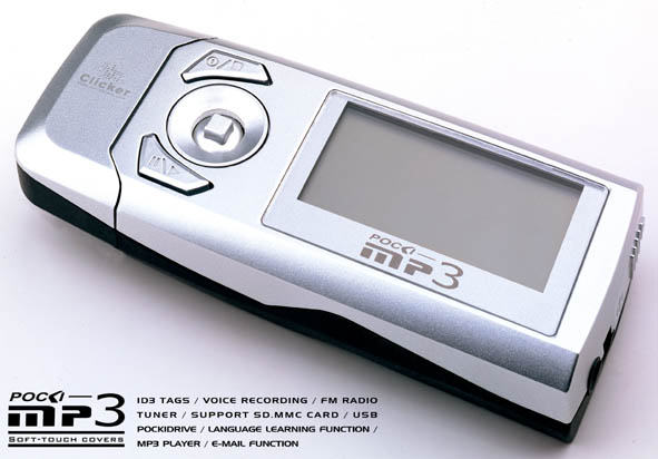 **Multi-language menu: English, Chinese, Korean, Japanese, Germany **ID3 tags supported **Bulti-in FM radio tuner **Dimension: ( L x W x H ) 92 x 37 x 21mm, Weight: 43g **With e-mail program in bulti-in flash memory **Leather-touch soft cover **Backlight dot matrix big LCD screen (128 x 64) **Pocki-MP3 can be used as USB mass storage from 128MB ~ 256MB **Powered by AAA Alkaline or rechargeable Ni-MH battery **SD/MMC card reader supported **32kbps high quality voice recording **6-Mode Equalizer: Normal, Classic, Rock |