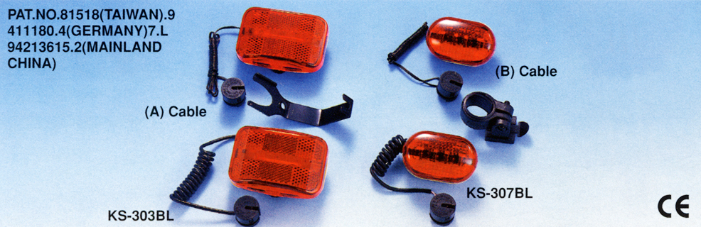 Model KS-303BL-2C (3 LED) steady/brake light Model KS-303BL-2F (3 LED) Flash/brake Light Model KS-303BL-3 (5 LED) Flash/Steady/Brake light Battery Use: No.3.1.5V (AA batteries) Model KS-303BL-2C (3 LED) steady/brake light Model KS-303BL-2F (3 LED) Flash/brake Light Model KS-303BL-3 (5 LED) Flash/Steady/Brake light Battery Use: No.3.1.5V (AA batteries) Type A: Cable A Type B: Cable B Packing: 1 PCE/Blister & card |