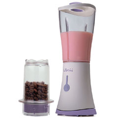 Pecial design for blend and grind. Both are simple to operate and can be converted from one to the other in seconds. 18 ounce (0.5 liter) capacity for plastic juice jar. 2.5 ounce (70g) coffee bean chamber, enough for 12 cups of coffee. Powerful 200 watts. Removable blade assembly for easy cleaning. Quad-angle stainless steel cutting and mixing blades insure perfectly smooth drink without unwanted ice or fruit chunks. Patented safety ON/OFF switch. Waterproof touch pad. Sure grip feet to prevent skidding. Conceal-style cord wrap. |