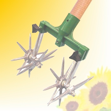 Gardening cultivator, aluminum, 2 wheels with 48" wooden pole.
