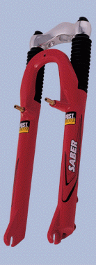 SABER-SL 6061-T6 aircraft grade aluminum alloy cold forged crown One-piece aluminum alloy fork blades with leading dropout and V type brake brace. Chromoly stanchion tube. Progressive spring rate elastomer and coil spring TG joint (Triple Guard Joint) 72mm travel (2.8 inches) Finger turnable preload adjustment Brake mounts : V-brake and disc brake mounts Overall Length (axle to bearing seat) : 459mm Rake (off-set) : 38mm Weight : 1.9kg Color : Red or to order |
