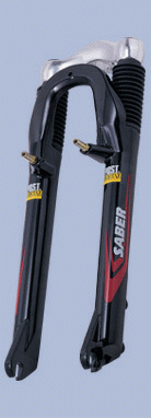 SABER-SE 6061-T6 aircraft grade aluminum alloy cold forged crown One-piece aluminum alloy fork blades with leading dropout and V type brake brace. High strength Hi-Ten steel stanchion tube Progressive spring rate elastomer and coil spring TG joint (Triple Guard Joint) 63mm travel (2.5 inches) Brake mounts : V-brake and disc brake mounts Overall Length (axle to bearing seat) : 437mm Rake (off-set) : 38mm Weight : 2.0kg Color : Black or to order |