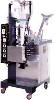 No staples need be applied, meeting with sanitary requirements. Devices automatically attach the tag to the string, and the string to the tea-bag. This machine is designed for three sides sealing operations. The machine may be fitted with a product out-fitting conveyor for convenient product collection. (Conveyor supplied as optional). The entire procedure from weighing, bag forming, filling and sealing to cutting and packaging is fully automatically operated. Convenient adjustment of weighing plate. |