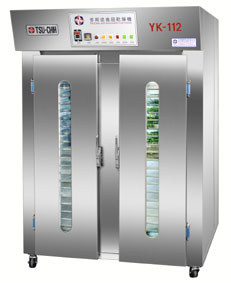 This machine is device with many trays in the cabinet. The food is spread out on the tray generally quite thinly. Dried medium temperature air of the whole circulation system sweep across the trays. The humid existing in the process material is absorbed by dry air. The moist vapor is condensed to be water by cooling system. Then the water will be extracting out. That is how the low temperature drying takes place. The drying air could be setting the temperature at 25¢X~60¢XC(77¢X~140¢XF) .