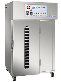 | This machine is device with many trays in the cabinet. The food is spread out on the tray generally quite thinly. Dried medium temperature air of the whole circulation system sweep across the trays. The humid existing in the process material is absorbed by dry air. The moist vapor is condensed to be water by cooling system. Then the water will be extracting out. That is how the low temperature drying takes place. The drying air could be setting the temperature at 25¢X~60¢XC(77¢X~140¢XF) . |