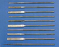 TH10 precise oblique flat rasp 10 pieces set The total length 130mm. the handle diameter 3mm. the diamond length 35mm Standard granule degree: Diamond types: SD/CBN Please designate .