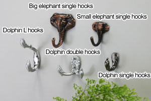 Big elephant single hooks antique copper plated Small elephant single hooks antique copper plated Dolphin L hooks Satin chrome plated Dolphin double hooks Satin chrome plated Dolphin single hooks black nickel plated