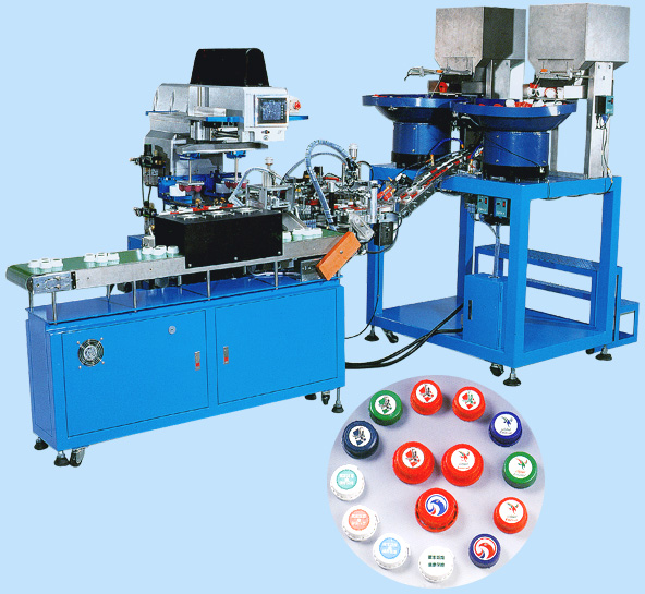Applications: Suitable for large caps 2 color printing. Custom-made machine is available and welcome. Color : 2 Max Printing Plate : £p20 Output / Hour : 3,600 Dimension (L x W x H) : 2,000 x 1,300 x 2,000 (mm) Net WT : 1,500 kg