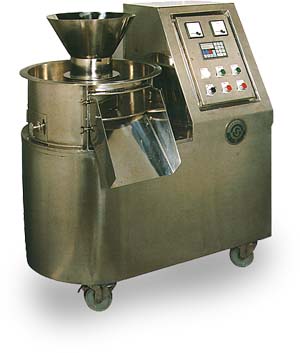 Add proper amount of binder to the materials to be granulated and mix evenly, then pour into the funnel of granulating machine. Using a special ppushing blade in the screen and reverse pressing to push the articles out of the screen, then collected by a disk to the scraaper at the front for scraping. The yield is three times more than the ordinary franulating machine. Using less water to granulate simplifies pre-treatment of granulating process. Easy to operate, wide range application. The speed of machine is non-step variable. The pore siae of screen can be changed to the most appropriate requirement. Easy to assemble and dismantle. Grains granulated by this machine can attain an even hardness and uniform size. Can make screen with pore diameter from 0.5m/m to assemble and dismantle. |