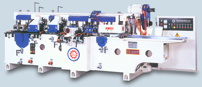 * The pneumatic feeding rollers clamp timber smoothly and utilize synchronous drive through a gearbox reducer, for powerful and precise stock feed. Feed speed can be infinitely adjusted. * The vertical and forward/reverse adjustment for all spindles can be operated from the front of the machine, saving work time. * The working table is made of robust alloy steel cast iron, and the protecting plate of cutter is made of vacuum treated, precision ground, high speed steel. * The cutting spindle can be lubricated from the front of the machine, providing ease of maintenance. * Newly designed pneumatic feed of oil lubrication to the table surface allows for the easy feeding of any kind of lumber. * Equipped with overload protection for cutting spindle. If an overload occurs, the feeding motor will stop lumber feed and after 3 seconds, all cutting spindles stop as well, providing safety and ensuring a long machine life. |