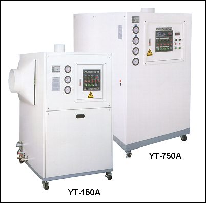 This industrial air conditioner is designed for injection molders, and it has the same functions as domestic air conditioners. It is used to control the ambient temperature around an injection mold. The presence of too much moisture in the environment may affect the quality of the mold surface because of condensation forming on the molded surface. This results in water drip marks on the product surface. This industrial air conditioner is ideal for controlling moisture and maintaining consistent quality in molded products. The industrial air conditioner is used for preform injection molding machines. The air conditioner is linked to the mold through its built-in blower. The evaporator and the condenser in the air conditioner process the moisturized air to produce dry cold air. The dry cold air is then blown into the mold chamber to minimoze moisture that causes condensation problems. The air conditioner fills the mold chamber with cold air and totally eliminates condensation on the mold surface whilst it is cooling. Condensation removal principle - How the moisture is eliminated. The air compressor forces refrigerant into the evaporator, moisture will be condensed. The blower then delivers cold, dry air into the mold chamber removing any condensation on molded surfaces. |