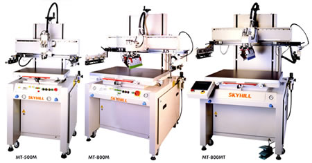 1.Impored cylinders from Japan to ensure good quality. 2.The screen is vertically positioned to prevent ink overflow from the side, therefore lowering ink consumption. 3.Equipped with THK latest precision linear motion quides and DC motor, printing can be low noise, high precision, wear-less and step-less adjustment. 4.Squeegee and flood bar, with THK latest precision linear motion guides, is easy to clean, reset and always wear-less. 5.Sensor is provides for controlling the printing stroke, which can be laterally adjusted to suit various screen sizes. 6.The printing table is radially designed to provide powerful suction with easy control. 7.The printing table is equipped with 3 sets of micrometric adjustment knobs for precision alignment of printing in lengthwise, lateral, and angular directions. 8.With pneumatic-powered hydraulic peel-off system (for MT-800M/800MT only) screen peeling speed and position are adjustable to avoid sticking. Also, it is ideal for large format and dot pattern printing. |