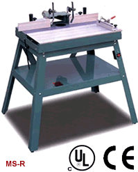It accepts any brand of portable router from 3/4 HP to 5 HP motor. The table can be tilted 45o. The aluminum table is precision ground. The sliding table is fitted with a toggle clamp for fast workpiece clamping Precision aluminum fence. 2" diameter dust hood. The key switch prevents unauthorized operation. Steel stand included. An aluminum sliding table for convenient operations. Spring hold-down is supplied as standard accessory |