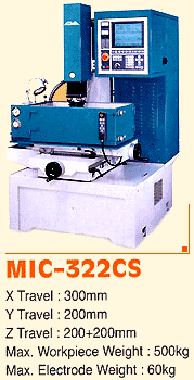 ltem\Model MIC-322CS Work Table size mm 600x300 X,Y,Z Travel mm 300x200x200+200 Electrode Plate to Work Table mm 150-550 Max.Electrode Weight kg 60 Max.Workpiece Weight kg 500 Work Tank Size mm 820x500x300 Weight of Machine Unit kg 1300 Outside Dimensions mm 1360x1430x2100