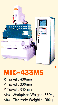 ltem\Model MIC-433MS Work Table size mm 650x350 X,Y,Z Travel mm 400x300x300 Electrode Plate to Work Table mm 270-570 Max.Electrode Weight kg 100 Max.Workpiece Weight kg 550 Work Tank Size mm 1020x550x350 Weight of Machine Unit kg 1150 Outside Dimensions mm 1400x1380x2250