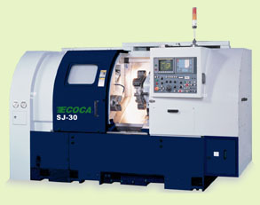 * V12 turret has 240mm dia. precision curvic coupling for smooth, accurate operation and location. * Powerful AC spindle motor for greater power & torque over the whole speed range. * "Heard rail" design provides rigidity to the whole bed & base assembly, ensuring long life accuracy plus high positioning speeds of the saddle & cross slide. * X-axis 15M(49') / min, Z axis 20M(66') / min. * Dynamically balanced spindle ensuring smooth running up to 4000rpm. * Separate coolant tank for easy cleaning and heat dissipation from the main body. SJ-25HT * AC servo drives directly coupled to ballscrews through adjustable torque couplings for operator safety & machine protection. * Thermal & mechanical stability provides repeatability of "5“gm". * 30 deg slant design together with carefully styled guarding & sealing ensures fast, efficient chip & scrap clearance within a leak-proof cabinet. * Ergonomically designed & user friendly control panel. * The rigidity of the frame & robust mounting of spindle, "9mm in 'Z' direction". |