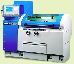 * Full guard FLAT bed CNC lathe. * Windows 95 operating system. * Max. 4000 rpm spindle speed. * High rigidity spindle with GAMET P2 class taper roller bearings arrangement. PC technology, combined with ECOCA powerful :Teach-In" user interface allows fast program input and editing. A series of cascading screens help the user to define the necessary data in a logical sequence. |