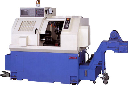 Now we have a completed range of CNC turning centers - from 2-axis gang type to 7-axis turret type. Max. swing over bed 320 mm. Max. turning diameter 200 mm. Max. turning length 225 mm. (turret) and 265 mm. (gang type tooling system). 20¢X slant bed structure. 8-position turret . Chip conveyor shown in picture is optional. |