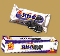 RITE Dark Chocolate Biscuit with Vanilla cream. The Biscuit sandwich is circular in shape.