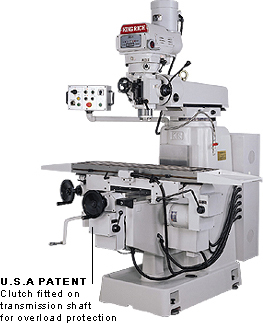 Standard: American red Turcite on X and Y axes Dovetail on X axis Square slideways on Y, Z axes Hardened and ground X, Y, Z axes and table 1.5 HP rapid vertical motor X and Y axes ballscrews (C7 grade) Inverter control on X and Y axes Electrics system Auto lubrication Coolant pump Optional: 5HP Inverter head (7.5HP option) Coolant tray Halogen working light Roller type Y-Axis up-down chip guard Steel slide cover on Y axis front Air power drawbar DRO system |