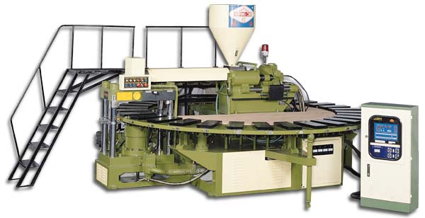 This machine is suitable for all kinds of thermoplastic raw materials, foaming of non-foaming, such as T.P.U. P.V.C. T.P.R. etc for soles, injecting. Full automatic computer control system, need no skillful operator, can save lots of labors and time. Low noise, low revolving speed & high torque hydraulic motor to drive feeding shaft with stepless speed. The machines capacity for general shoes is 220 pairs/hour. Constructed of 30 mold stations for great mold loading capacity and mold variation. Also cooling time is increased. Employs proportional pressure control, The injection pressure on each station is individually controlled, ensuring superior production result. It's available to install specially plane automatic opening mold equipment to save labors and increased production capacity. |