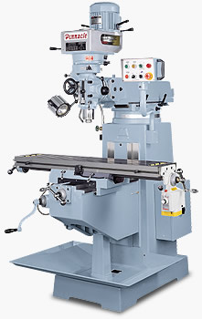 Easy to change high-low speed. Rigidly built from Meehanite Cast Iron. NT30# /R8 spindle taper. Square slideways on knee. Extra wide table working area 50" x 10". 16-speed step pulley head with powerful 3 HP motor. Hardened and ground X, Y, Z axes and table surface. |