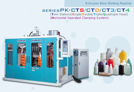 Built with safety devices to provide maximum protection for the machine operator. High plasticizing capacity extrusion screw is designed to handle material variations. Plasticizing screw and barrel is precision machined from special nitrogen treated steel. Water cooling technology controls feed zone temperature. Chiller circulated hydraulically controlled blow-pin. The twin station configuration allows for continuous blow molding. This eliminates down time and upgrards production. This series can operate with a selected single station. |