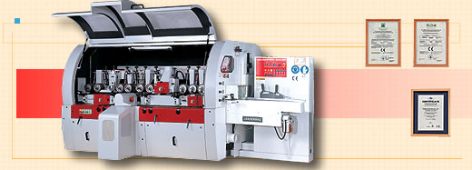 Faster feed speeds of up to 24 meters a minute are standard. Adjustment of each spindle can be easily performed using the front adjustment level. The full safety enclosure serves as a chip guard and helps to reduce noise. Each spindle is driven by an individual motor for powerful milling and easy control, side head is combined work. Pneumatic pressure of the feed rollers can be easily set to provide an outstanding feeding effect. Table surface is hard-chrome plated for maximum wear resistance. |