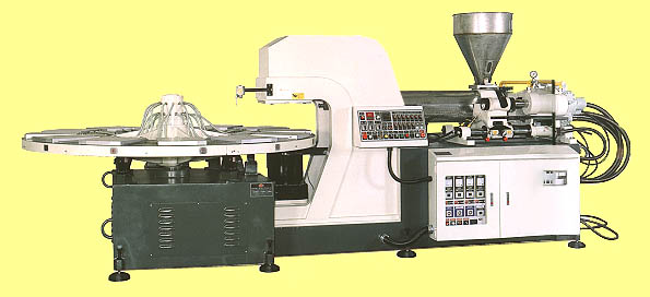 1. This machine is suitable for P.V.C.,T.P.R. foaming & unfoaming material,T.P.U. & T.P.E. to produce high-level shoe soles. 2.Feeding screw special design with high efficient hydraulic motor can feed material smoothly and quickly.This can produce soles in beauty look & in steady quality. 3.Full computer P.L.C. control system can set the different injection capacity base on the products styles & sizes.Also with the logical hydraulic system ,it can set the injection pressure & injection speed in the different station. 4.Cylinder with strong mould clamping design has high mould clamping force and can produce one piece or two pieces soles at the same time. This increases the production & decrease the cost .Also priducts without bur. 5.Mould cooling uses water cooling type to make better pattern results and steady quality in products. 6.Special injection device can be suitable for mould top injection.Its range is unlimited to increase the machine functions. 7. Automatic monitoring system and broken-down display system ,the need maintenance point can be indicated clearly and quickly.Even an unskilled worker can operate and maintain the machine easily.This can decrease maintenance cost. 8. Disc control by hydraulic transition system and monitor with computer automatically. 9.In the automatic open mould system & vacuum autoloader system,only need one person to operate it.This can decrease the production cost. |