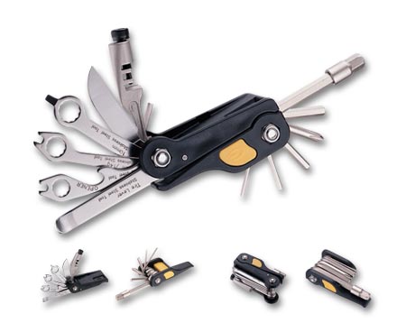 Two-piece multi-function DIY tool for bike 19 Function ,Folding Body 2 Color surface, Engineering thermoplastic 8/6/5/4/3/2.5/2mm Hex Key, +Screwdriver (# 6150) Chain Rivet Extractor(Cr-Mo) 10/9/8mm Spanner Spoke Wrench(For #14G,#15G) Opener Knife Screwdriver (Stainless) Tire lever Weight :225gm./set |